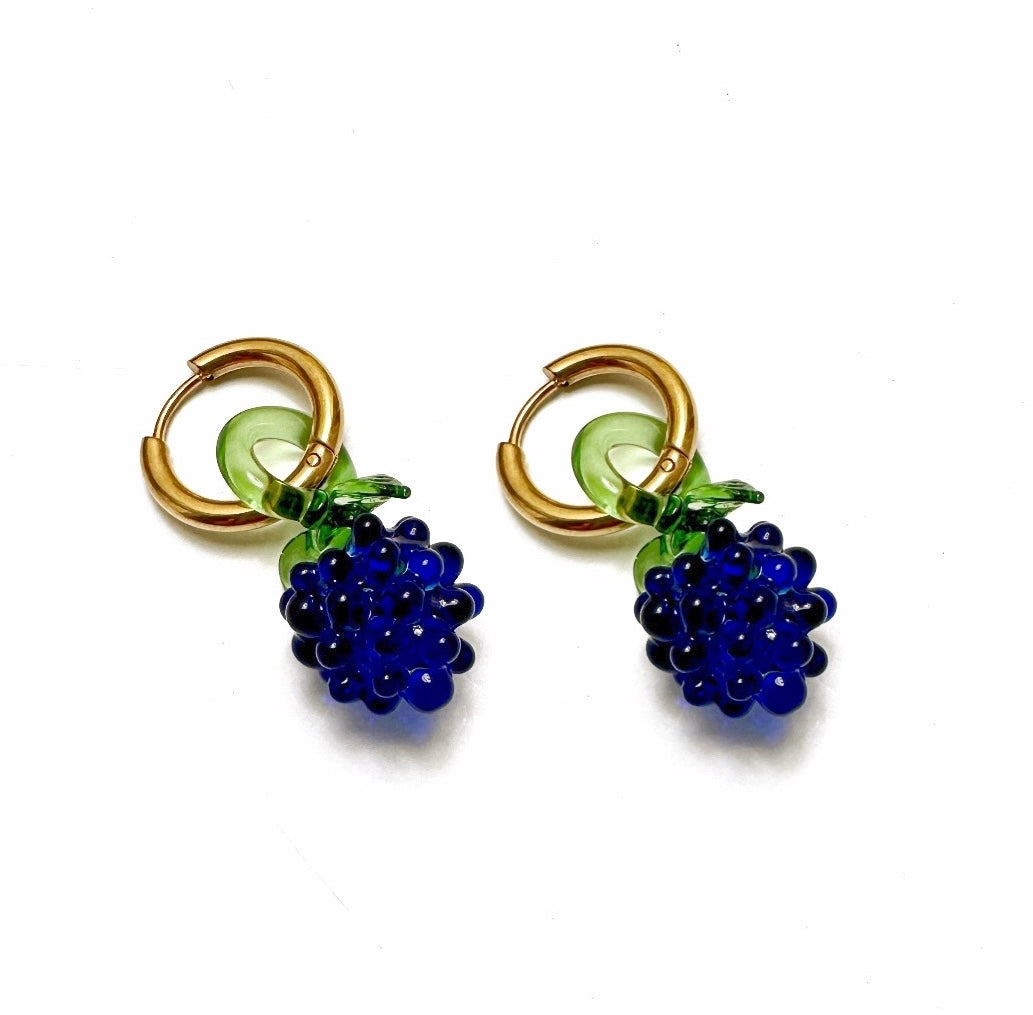 Arracadas de acero inoxidable mini donut con dije blackberry mini de vidrio soplado hecho a mano.